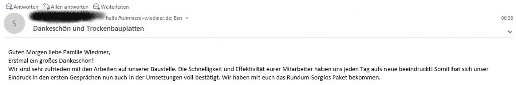 Wir waren gerade auf der Zielgeraden einer Dachsanierung in Burgrieden, als wir diese E-Mail unserer Bauherrschaft morgens im Postfach fanden.