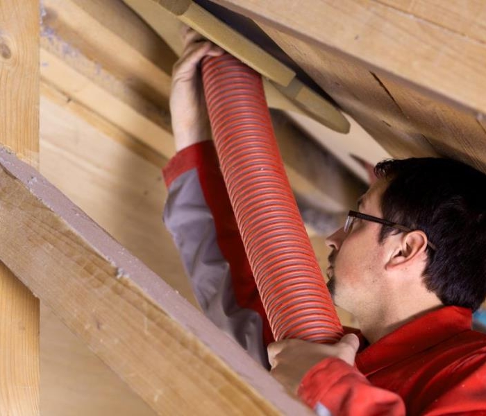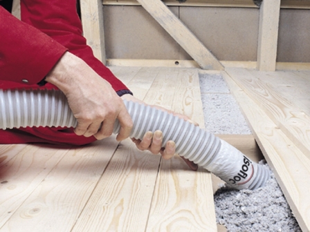3. Die Zellulose wird über einen Schlauch eingeblasen und die Löcher anschließend verschlossen.