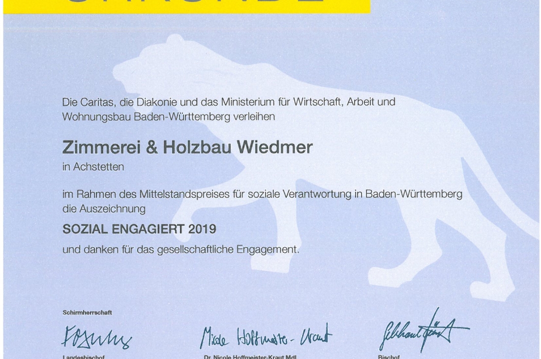 Zimmerei & Holzbau Wiedmer als sozial engagiertes Unternehmen ausgezeichnet
