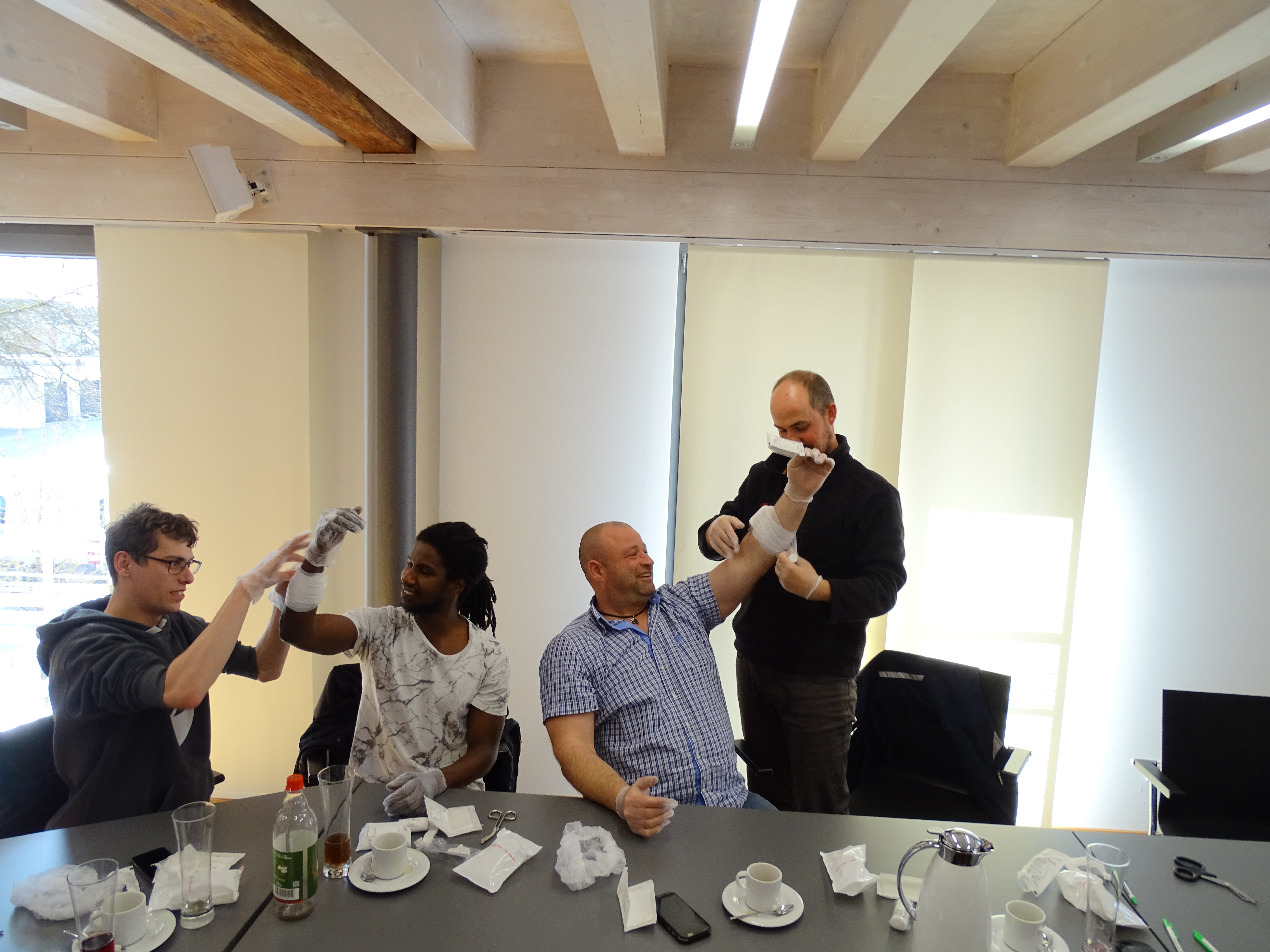 Druckverband – hat den Tag spannend und vielseitig gestaltet. Da der letzte Erste-Hilfe-Kurs bei den meisten doch schon einige Jahre her gewesen ist, war die Auffrischung dringend nötig. Und nun kann jeder wieder mit dem sicheren Gefühl und dem Wissen auf der Baustelle arbeiten, dass jemand da ist, der weiß was zu tun ist, sollte doch einmal etwas passieren – wir hoffen, dieser Tag lässt noch lange auf sich warten!