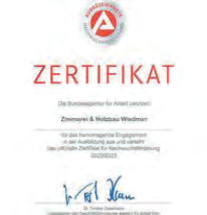 Umso mehr freuen wir uns, als wir einen Anruf von der Agentur für Arbeit Ulm erhielten, weil wir als   Preisträger für das offizielle Zertifikat für Nachwuchsförderung 2022/2023 ausgewählt waren. Die Agentur für Arbeit Ulm zeichnete in diesem Jahr drei Betriebe in ihrer Region aus, die sich in besonderem Maße in der Ausbildungsarbeit engagieren und innovative Ideen zur Nachwuchsförderung entwickeln.