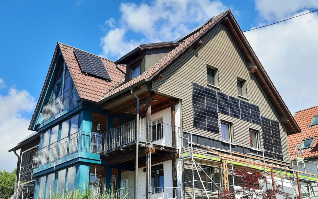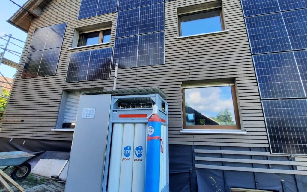 Für die abschließende Beplankung entschied sich der Kunde für Rhombusleisten, die nicht nur ästhetisch ansprechend sind, sondern auch durch ihre Langlebigkeit und Wetterbeständigkeit überzeugen. Eine besondere Herausforderung bei diesem Projekt war die Integration der neuen PV-Module in die Fassadengestaltung. Es war von entscheidender Bedeutung, dass die Fassade optisch harmonisch und technisch funktional an die Photovoltaikanlage angepasst wurde. Unser Team meisterte diese Aufgabe mit Bravour, so dass die Fassade nun nicht nur energieeffizient ist, sondern auch durch die PV-Module eigenen Strom produziert. Dieser wird in einem Wasserstoffspeicher gespeichert. Das Besondere an diesem Solar-Wasserstoffsystem ist, dass der Stromüberschuss im Sommer mit einer einzigartigen Speicherkapazität von bis zu 1.500 Kilowattstunden in Form von Wasserstoff gespeichert und in den Wintermonaten wieder als Strom und Wärme zur Verfügung gestellt wird.